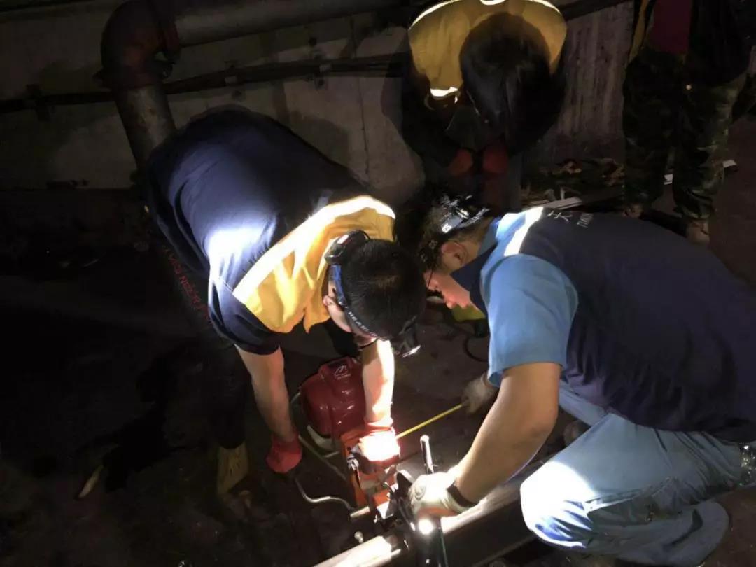 03:40,在辦理好搶修作業(yè)手續(xù)后,搶修人員到達故障位置并立刻勘查故障情況。傷損位于鋼軌底部,但是距離人防門框架不足150mm,原定的搶修加固方案受到了嚴重制約,怎么辦?此時距離送電不到1小時了,如果啟動換軌方案的話還要聯(lián)系電力和房建專業(yè)人員配合,就算人到了時間也不允許了。項目部的搶修團隊分析了現(xiàn)場情況,在原有加固方案的基礎(chǔ)上,領(lǐng)工員楊本果提出鉆孔安裝魚尾板,依靠魚尾板的緊固力和支撐力,維持傷損鋼軌的病害不再發(fā)展,確保假期中列車的安全平穩(wěn)運營不受影響。說干就干,由于準(zhǔn)備充分,預(yù)案執(zhí)行到位,工具人員材料均已到場。20分鐘內(nèi),魚尾板就安裝完畢,緊緊地鎖緊了傷損,牢牢的穩(wěn)定了傷損,讓這一根鋼軌能夠繼續(xù)支撐列車運行。
