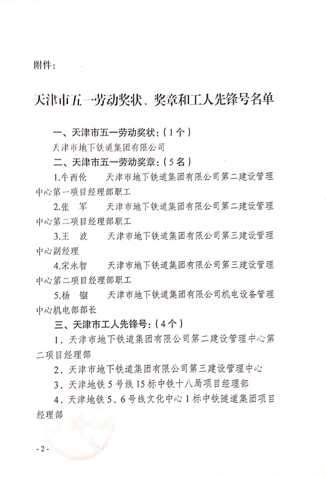 在勞動(dòng)競(jìng)賽過(guò)程中,涌現(xiàn)出了一批有突出貢獻(xiàn)的先進(jìn)集體和個(gè)人,為更好地選樹典型,激發(fā)參建員工的工作熱情,助推地鐵工程建設(shè),地鐵集團(tuán)工會(huì)向上級(jí)工會(huì)組織申報(bào)天津市五一勞動(dòng)獎(jiǎng)項(xiàng),收到批復(fù)榮獲獎(jiǎng)項(xiàng),具體名單如下: