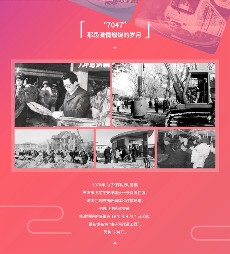 1970年4月7日,經(jīng)當(dāng)時(shí)的天津市革命委員會批準(zhǔn),天津市戰(zhàn)備地下通道墻子河改造工程立項(xiàng),即“7047工程”。這是現(xiàn)在天津地鐵1號線的前身。