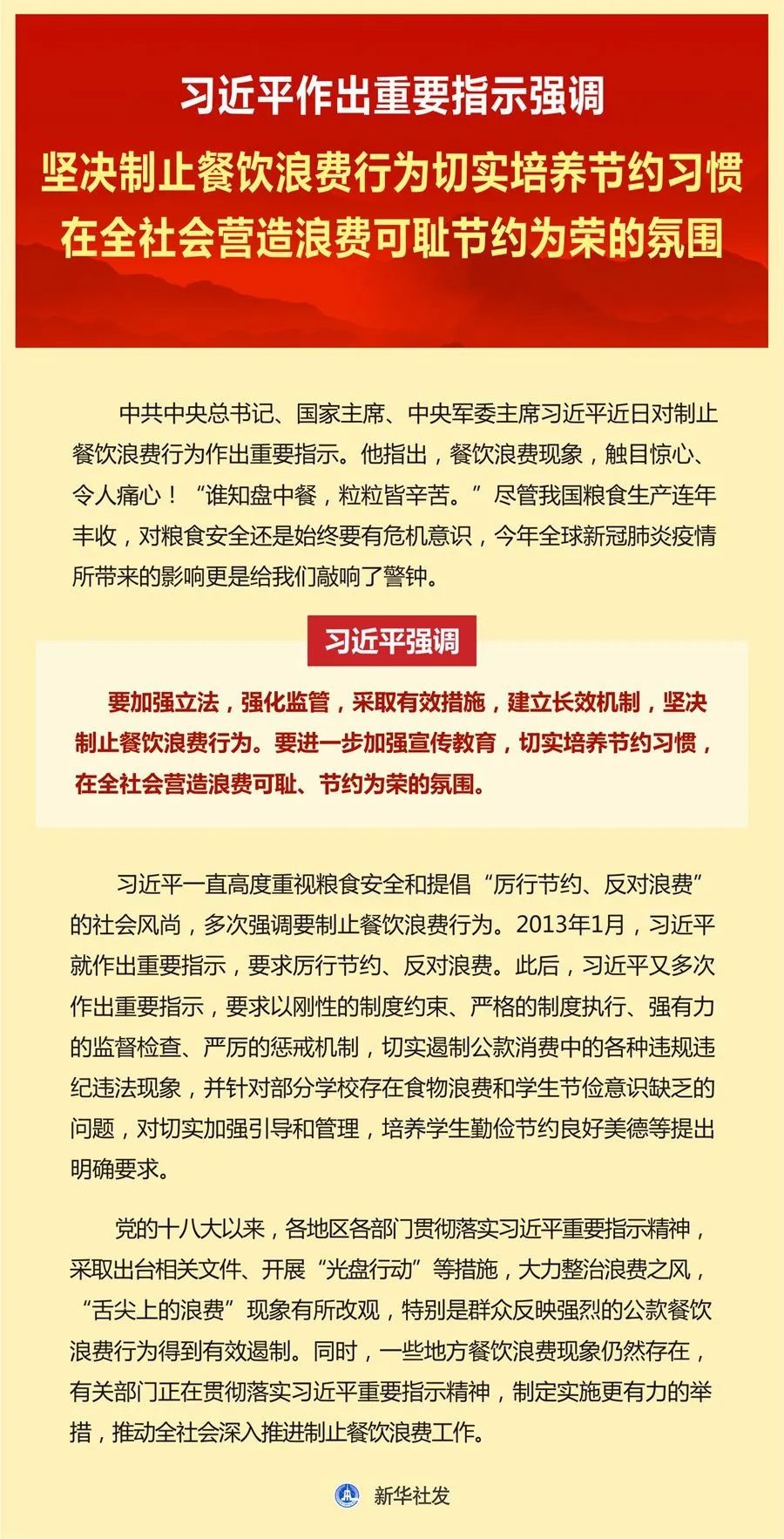 中共中央總書記、國家主席、中央軍委主席習近平近日對制止餐飲浪費行為作出重要指示。他指出,餐飲浪費現(xiàn)象,觸目驚心、令人痛心!“誰知盤中餐,粒粒皆辛苦。”盡管我國糧食生產(chǎn)連年豐收,對糧食安全還是始終要有危機意識,今年全球新冠肺炎疫情所帶來的影響更是給我們敲響了警鐘。