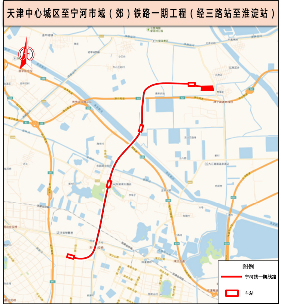 天津中心城區(qū)至寧河市域(郊)鐵路一期工程(經(jīng)三路站至淮淀站)走向示意圖