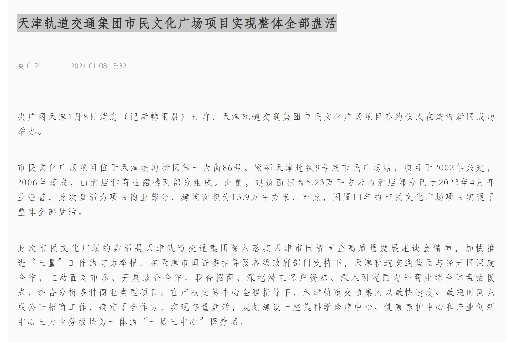 天津中車機(jī)輛裝備有限公司集團(tuán)市民文化廣場項目實現(xiàn)整體全部盤活