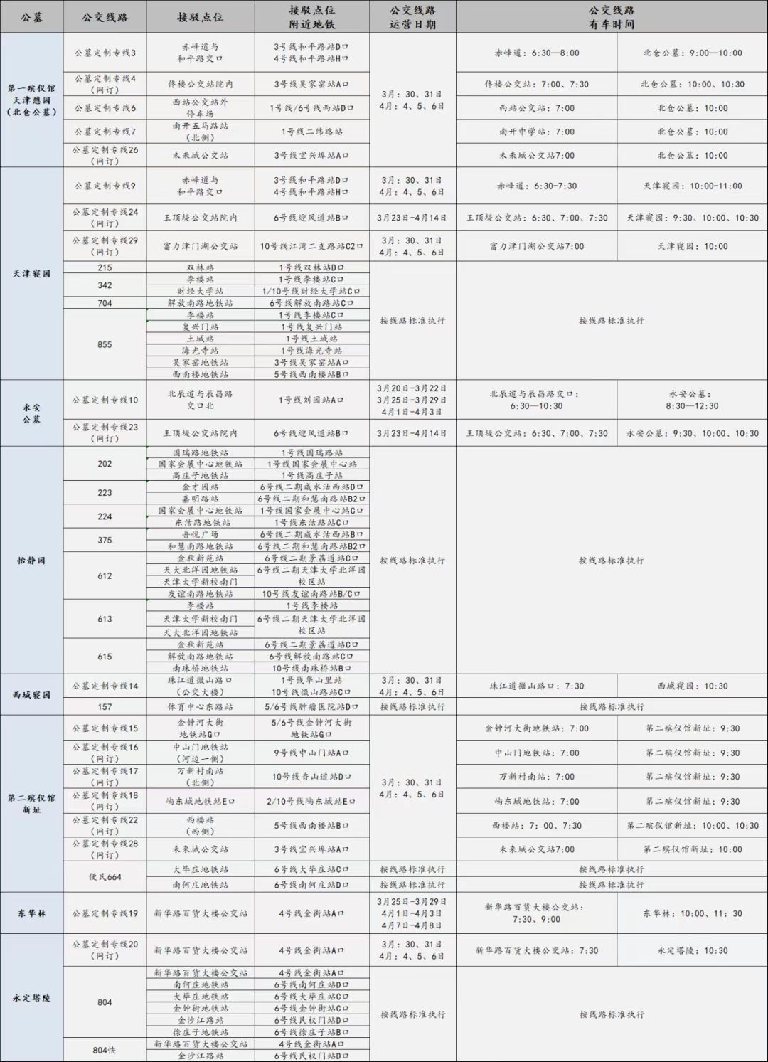 清明臨近,為做好我市祭掃保障工作,滿足市民乘客出行需求,天津地鐵聯(lián)合公交集團梳理有關(guān)地鐵公交換乘線路,乘客可根據(jù)目的地就近選擇接駁乘車,具體線路詳情如下圖所示。