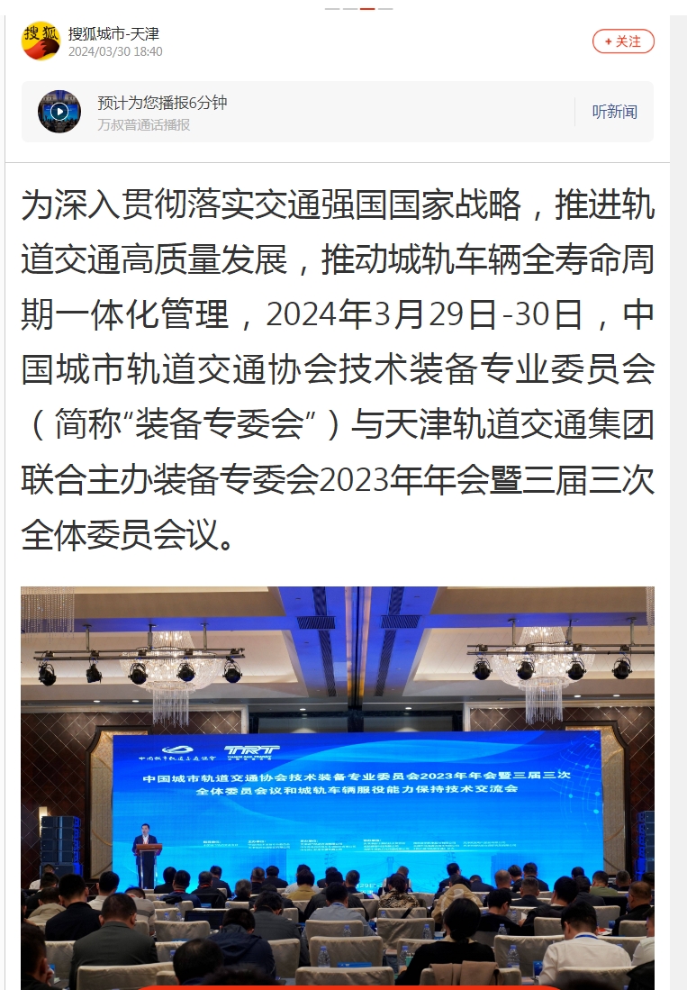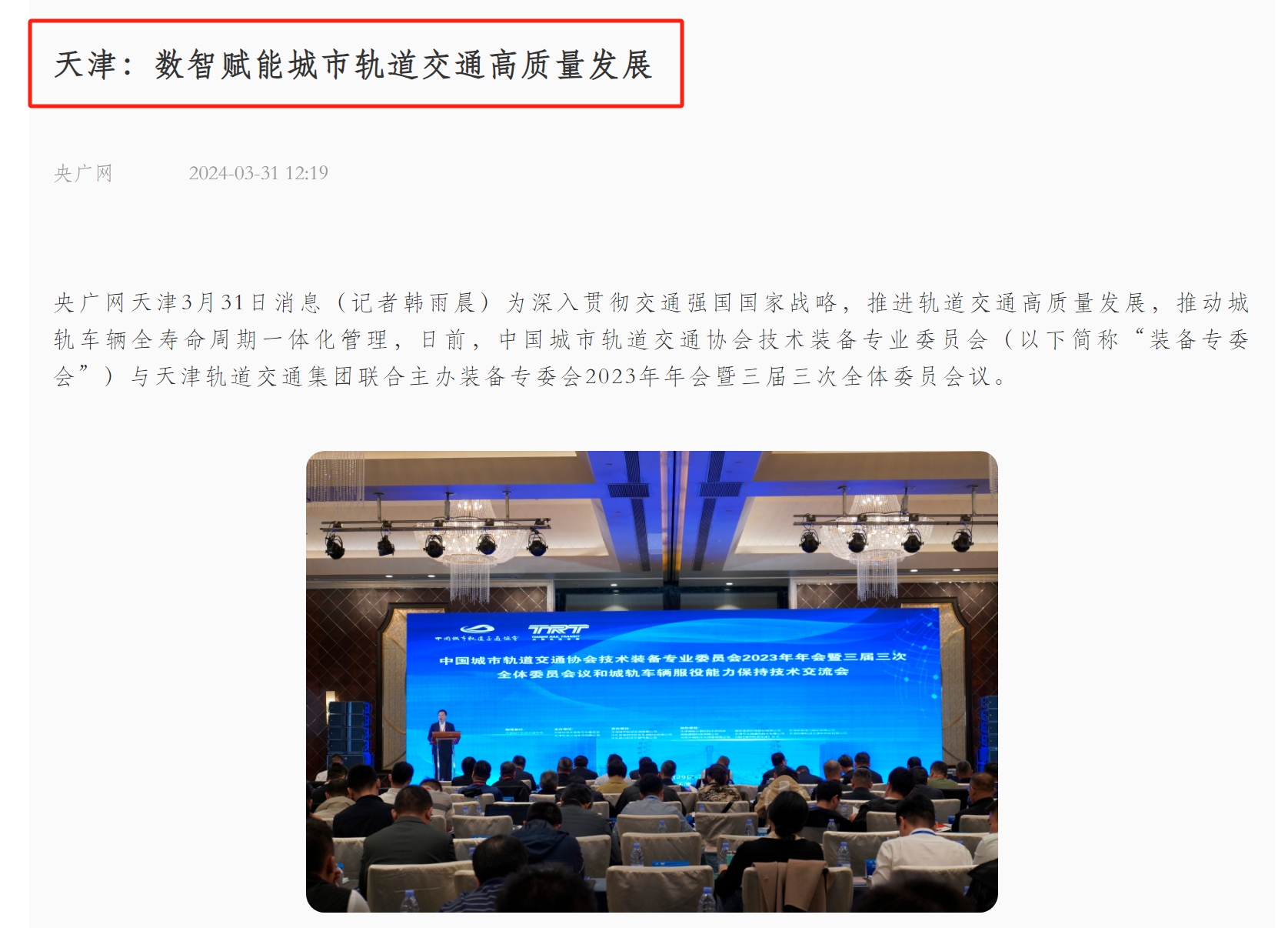 4月1日,各大媒體聚焦報(bào)道中國城市軌道交通協(xié)會(huì)技術(shù)裝備專委會(huì)2023年年會(huì)暨三屆三次全體委員會(huì)議在天津圓滿召開。??????