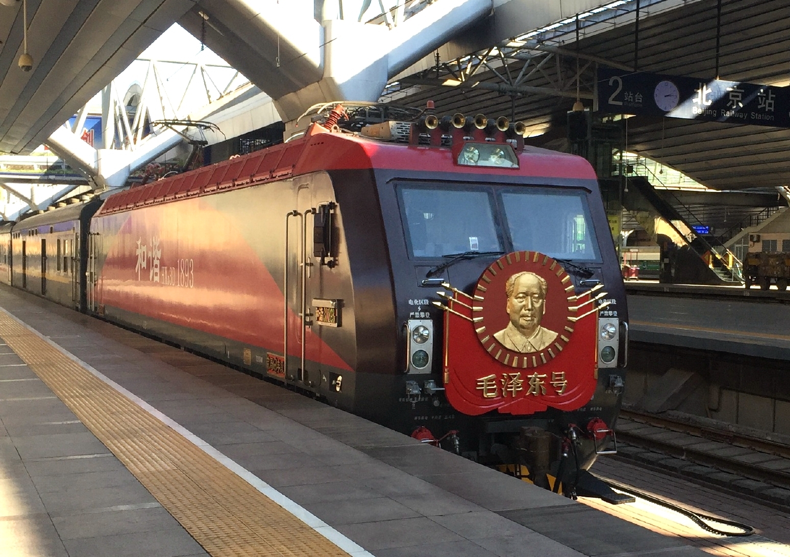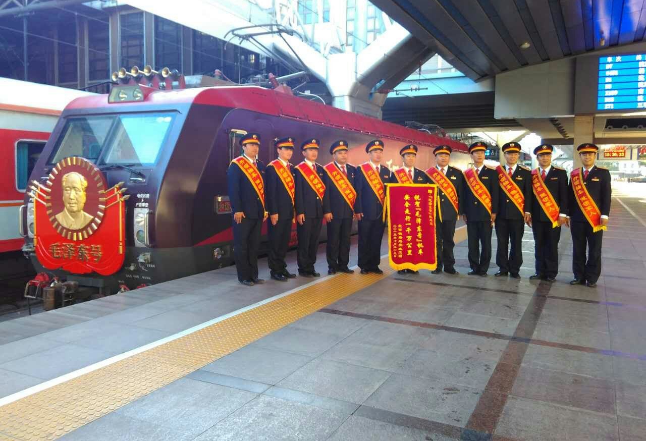 ??? 10月29日,“毛澤東號”電力機車牽引的長沙至北京T2次旅客列車駛?cè)氡本┱?站臺。北京鐵路局主要領(lǐng)導列隊迎接“毛澤東號”機車的平安歸來,舉行“毛澤東號”機車命名69周年暨安全走行1000萬公里慶祝儀式?!懊珴蓶|號”機車自1946年10月30日命名以來,以驕人的業(yè)績和先鋒模范作用,成為鐵路運輸安全生產(chǎn)的一面光輝旗幟。69年1000萬公里,相當于從地球到月球整整往返13次,再創(chuàng)中國鐵路機車安全走行新紀錄。