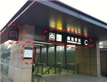 車站位置標(biāo)志內(nèi)容包括:軌道交通標(biāo)志、線路名稱、線路標(biāo)志色、車站名稱、出入口編號(hào)。???